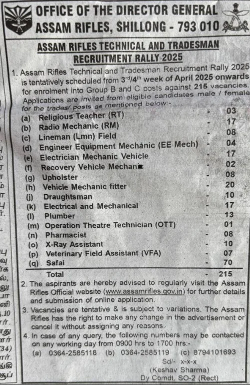 - Tentative Date of Assam Rifles Technical & Tradesman Recruitment Rally 2025: 03rd/04th Week of April 2025 Onwards