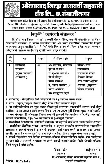 Aurangabad DCCB Recruitment 2025: Aurangabad District Central Co-operative Bank (Aurangabad DCCB) has released a notification at adccbank.in for recruitment to the Post of Executive Director (Chief Executive Officer) in Aurangabad – Maharashtra. Interested candidates can Apply Offline on or before 31-May-2025