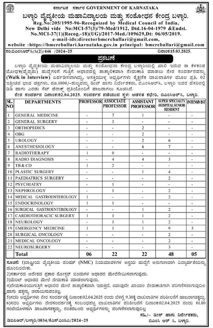 Interested and eligible candidates who searching for jobs in Karnataka can attend the walk-in-interview along with full bio-data, required self-attested documents (as mentioned in official notification) at the following Address: Administrative Office, BMCRC Bellary. on 02-Apr-2025