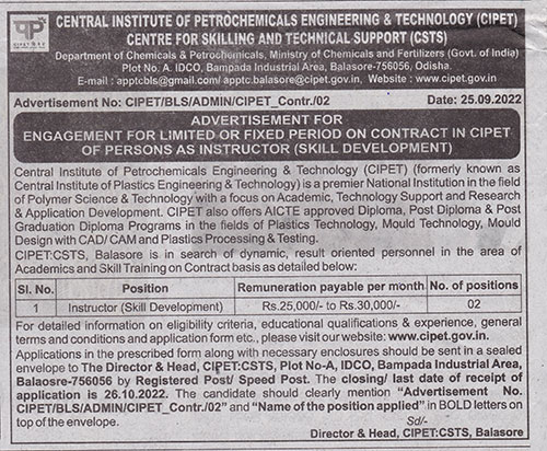 CIPET Recruitment 2022: Central Institute of Petrochemicals Engineering & Technology (CIPET) has released a notification at cipet.gov.in for recruitment to the Post of Instructor in Balasore – Odisha. Interested candidates can Apply Offline on or before 26-Oct-2022.
