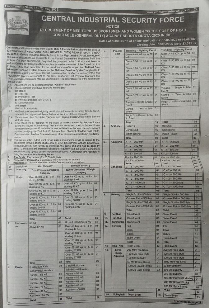 CISF Vacancy Details May 2025