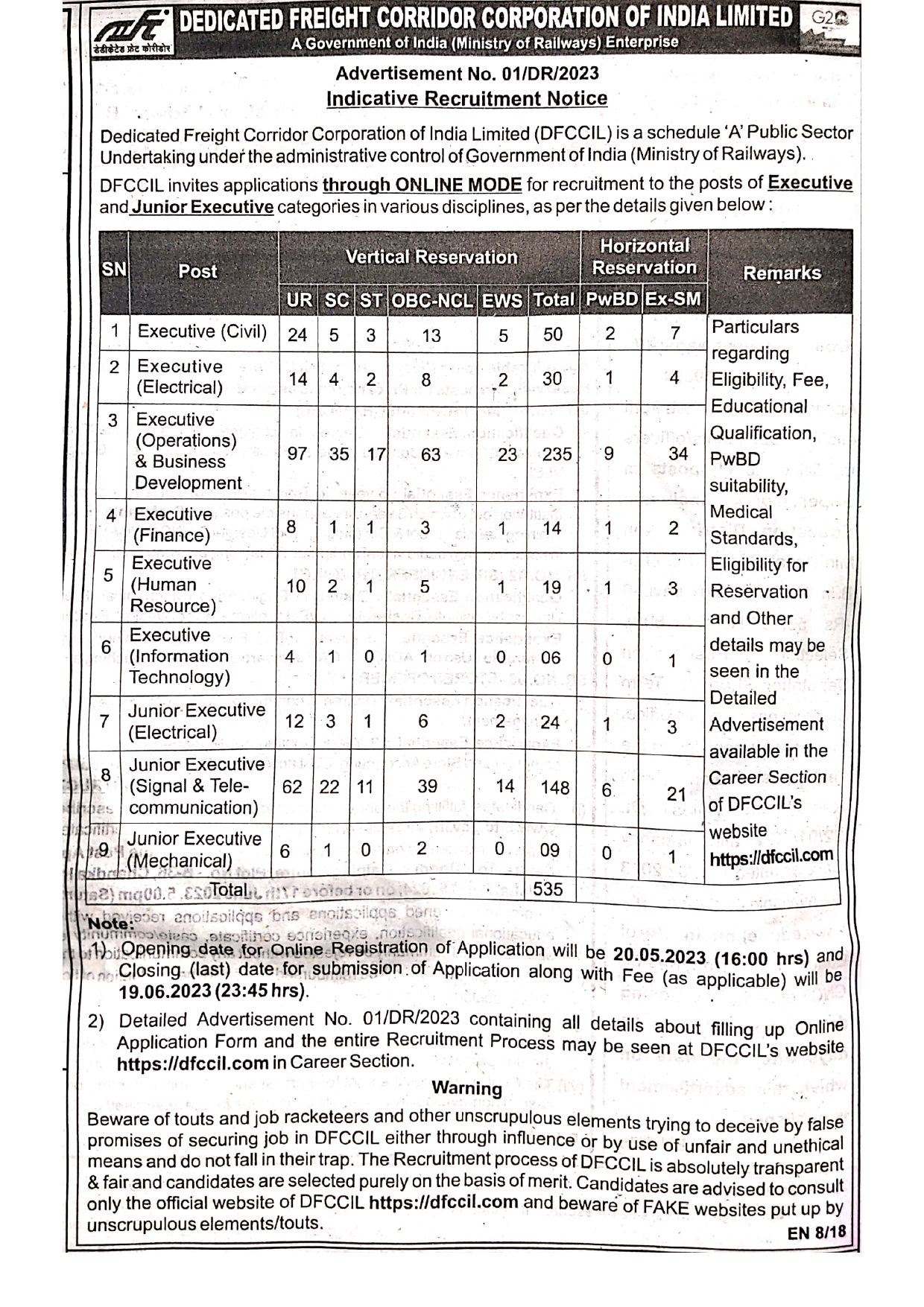 DFCCIL Recruitment 2023: Dedicated Freight Corridor Corporation of India Limited (DFCCIL) has released a notification at dfccil.com for recruitment to the Post of Executive, Junior Executive in All India. Interested candidates can Apply Online on or before 19-Jun-2023.