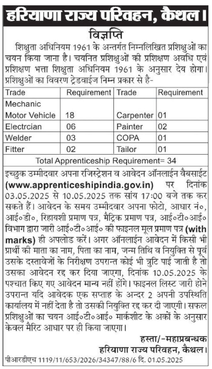 Haryana Roadways Recruitment 2025: Haryana Roadways (Haryana Roadways) has released a notification at hartrans.gov.in for recruitment to the Post of Apprentice in Kaithal – Haryana. Interested candidates can Apply Online on or before 10-May-2025