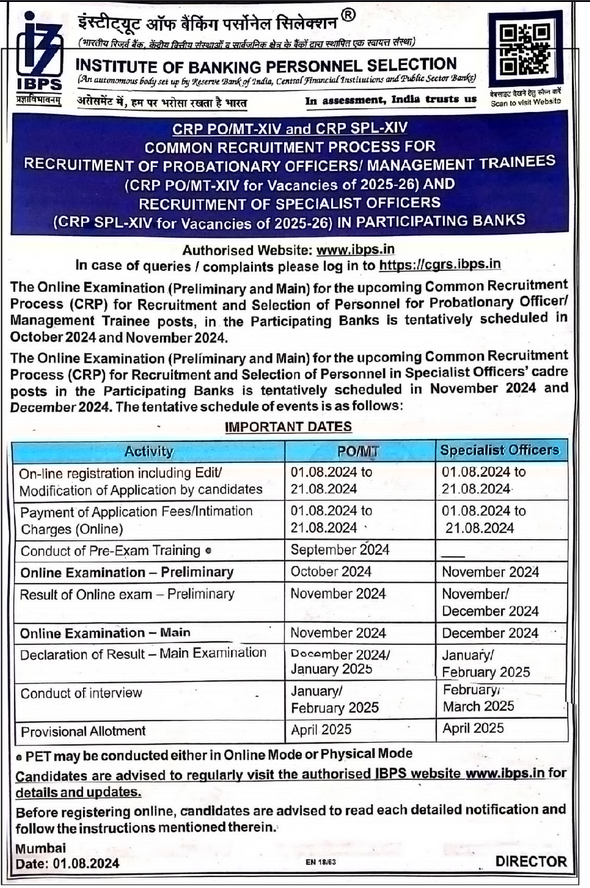 - Date of Online Examination – Main for Specialist Officers: December 2024