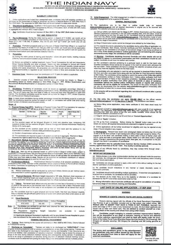Indian Navy Recruitment 2024: Indian Navy (Indian Navy) has released a notification at joinindiannavy.gov.in for recruitment to the Post of SSR Medical Assistant in All India. Interested candidates can Apply Online on or before 17-Sep-2024.