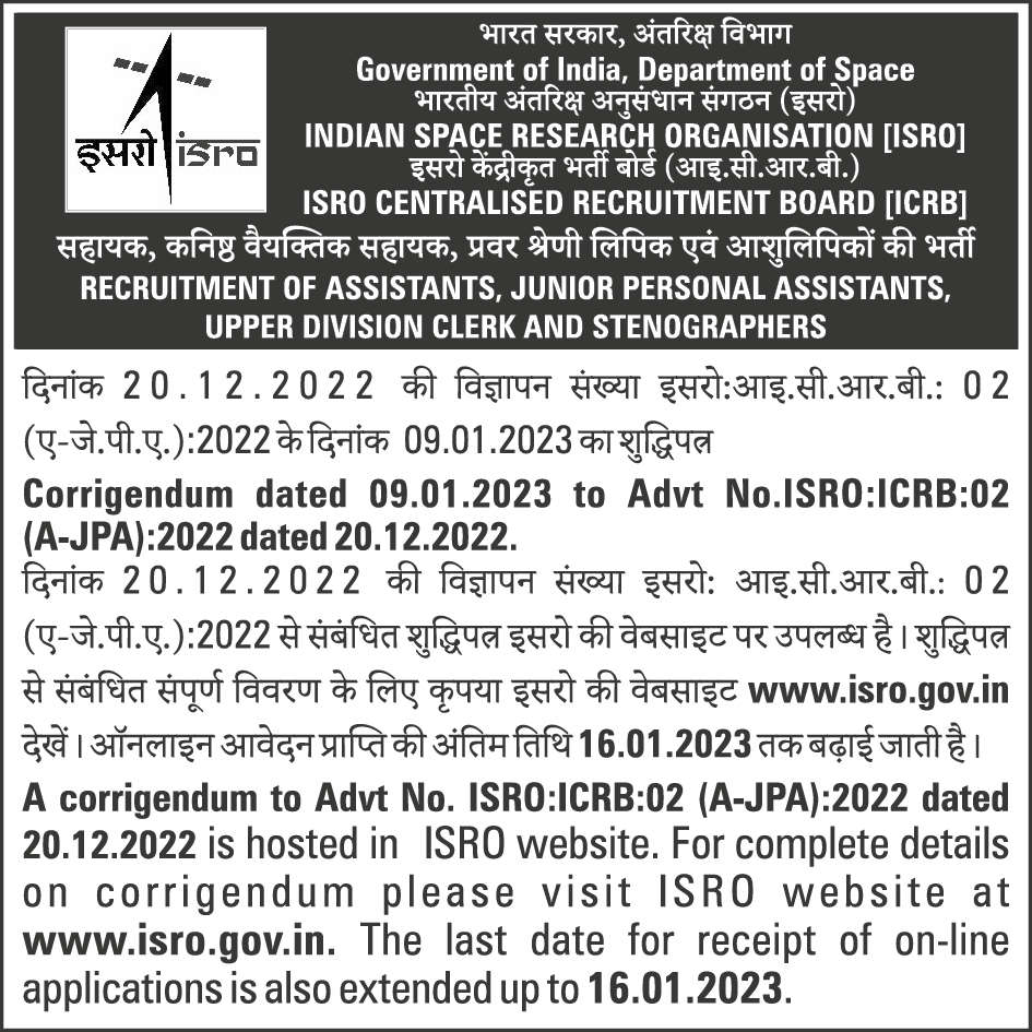 ISRO Recruitment 2023: Indian Space Research Organisation (ISRO) has released a notification at isro.gov.in for recruitment to the Post of Assistant, Junior Personal Assistant in All India. Interested candidates can Apply Online on or before 09-Jan-2023 (Last Date Expended Up to 16 -01 -2023) .