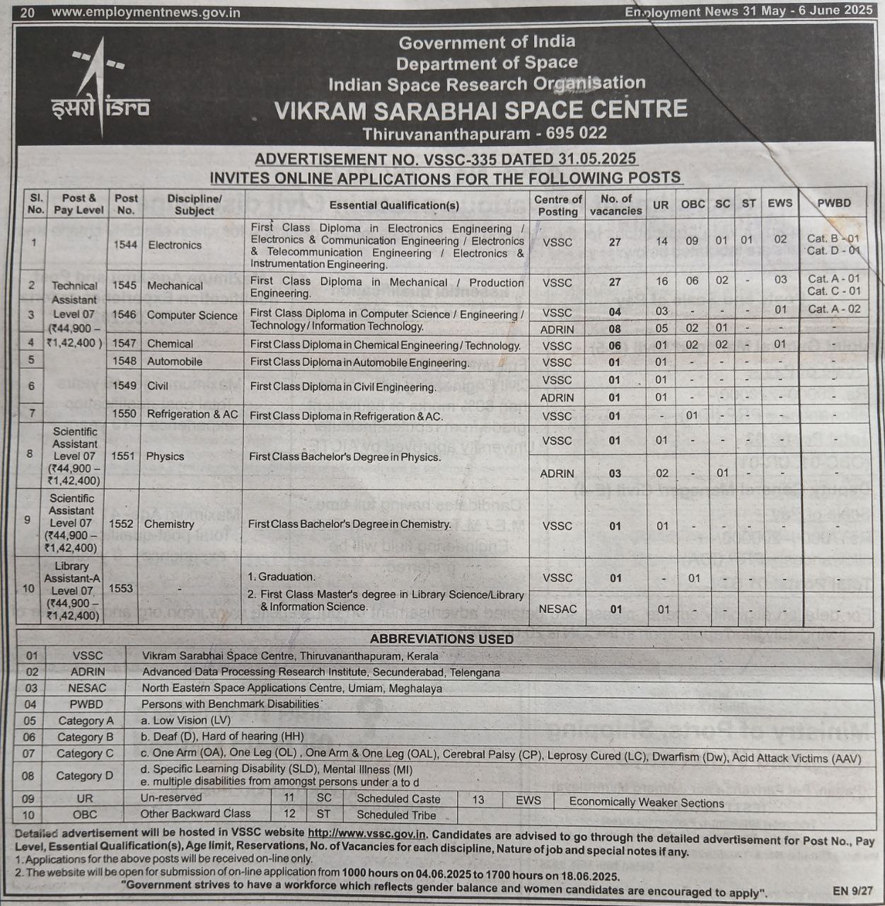 ISRO VSSC Recruitment 2025: Vikram Sarabhai Space Centre (ISRO VSSC) has released a notification at vssc.gov.in for recruitment to the Post of Technical & Scientific Assistant in Thiruvananthapuram – Kerala. Interested candidates can Apply Online on or before 18-Jun-2025.