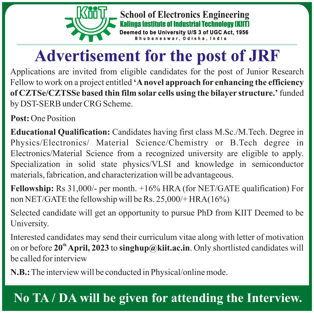KIIT Recruitment 2023: Kalinga Institute of Industrial Technology (KIIT) has released a notification at kiit.ac.in for recruitment to the Post of Junior Research Fellow (JRF) in Bhubaneswar – Odisha. Interested candidates can send an E-Mail on or before 20-Apr-2023.