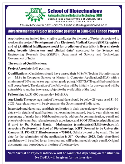 Interested and eligible candidates can apply offline through the prescribed application format. The Applicant needs to send the application form along with relevant self-attested documents to the Dr.Rajani Kanta Mahapatra, Associate Professor-I, School of Biotechnology, KIIT Deemed to be University, Campus 11, PO-KIIT, Bhubaneswar-751024, Odisha or by Email to [email protected] on or before 31-Oct-2023.