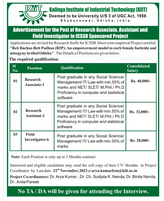 KIIT Recruitment 2023: Kalinga Institute of Industrial Technology (KIIT) has released a notification at kiit.ac.in for recruitment to the Post of Field Investigator, Research Assistant in Bhubaneswar – Odisha. Interested candidates can send an E-Mail on or before 22-Nov-2023.