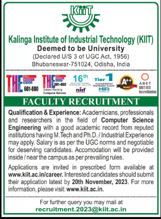 KIIT Recruitment 2023: Kalinga Institute of Industrial Technology (KIIT) has released a notification at kiit.ac.in for recruitment to the Post of Faculty in Bhubaneswar – Odisha. Interested candidates can Apply Online on or before 20-Nov-2023.