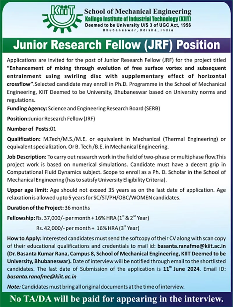 KIIT Recruitment 2024: Kalinga Institute of Industrial Technology (KIIT) has released a notification at kiit.ac.in for recruitment to the Post of Junior Research Fellow (JRF) in Bhubaneswar – Odisha. Interested candidates can send an E-Mail on or before 11-Jun-2024.