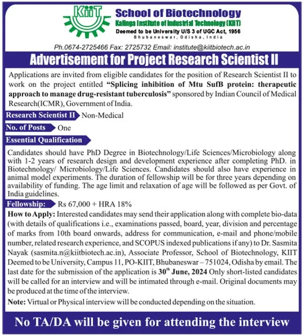 KIIT Recruitment 2024: Kalinga Institute of Industrial Technology (KIIT) has released a notification at kiit.ac.in for recruitment to the Post of Project Research Scientist II in Bhubaneswar – Odisha. Interested candidates can send an E-Mail on or before 30-Jun-2024.