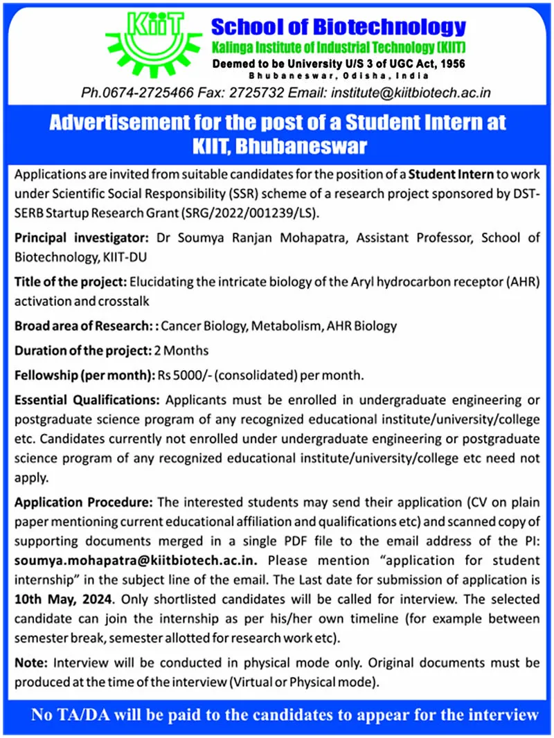KIIT Recruitment 2024: Kalinga Institute of Industrial Technology (KIIT) has released a notification at kiit.ac.in for recruitment to the Post of Student Intern in Bhubaneswar – Odisha. Interested candidates can send an E-Mail on or before 10-May-2024.