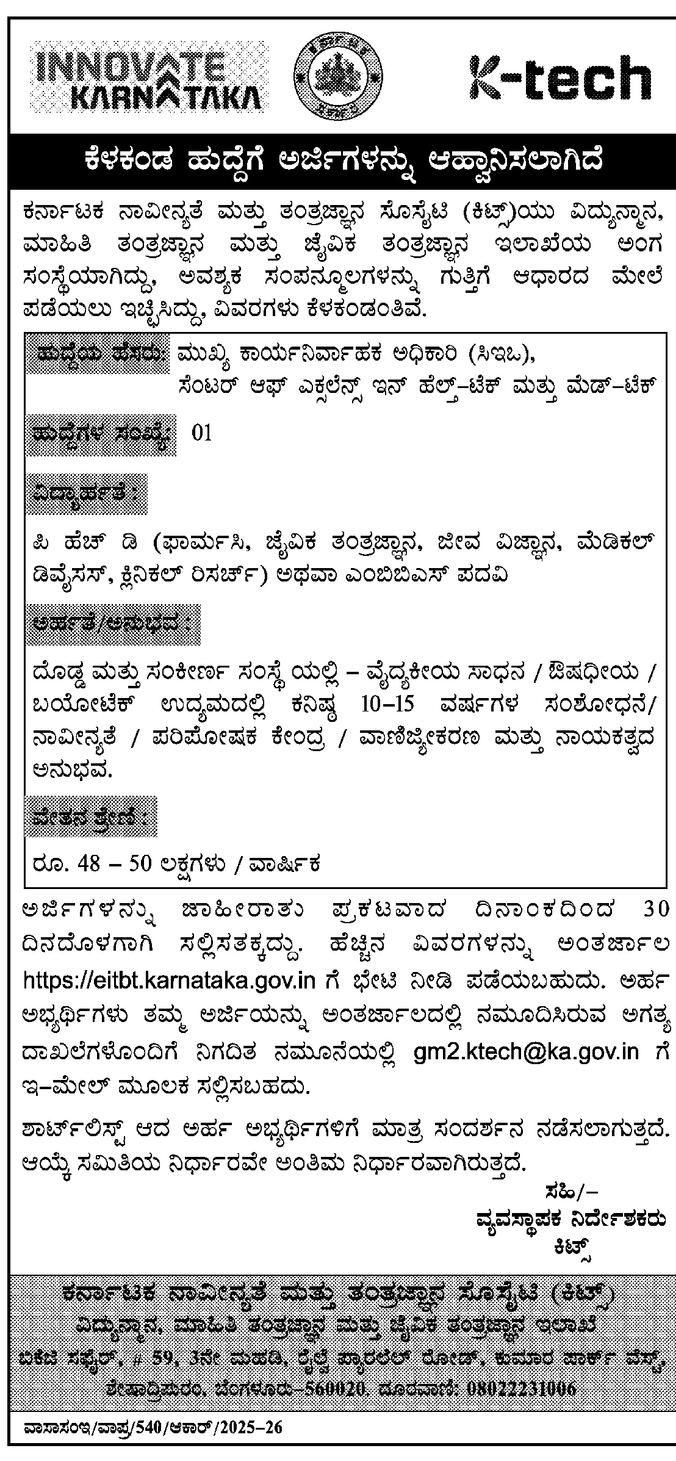 KITS Recruitment 2025: Karnataka Innovation & Technology Society (KITS) has released a notification at k-tech.karnataka.gov.in for recruitment to the Post of Chief Executive Officer (CEO) in Bengaluru – Karnataka. Interested candidates can send an E-Mail on or before 07-Jun-2025.