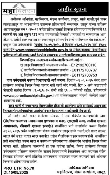 Interested and eligible candidates can apply offline through the prescribed application format. The Applicant needs to send the application form along with relevant self-attested documents to the Mahavitaran Mandal Office, Latur, Sale Galli, Old Power House, Latur. on or before 02-Jun-2025