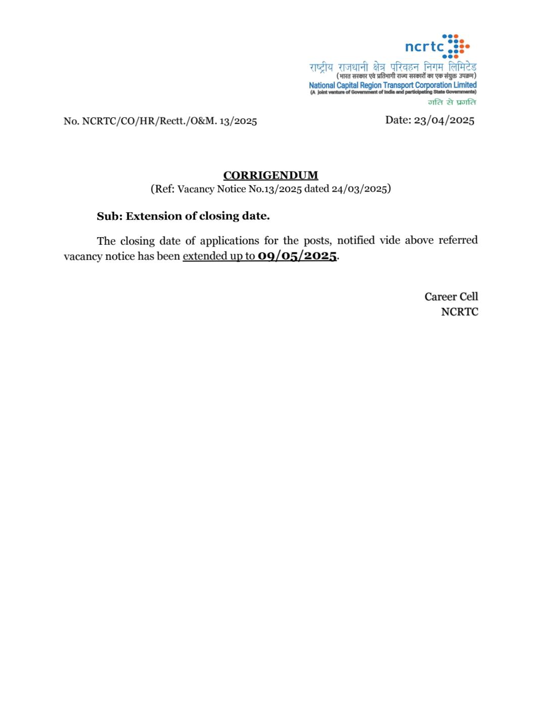 - Candidates should apply online only through NCRTC official website ncrtc.in