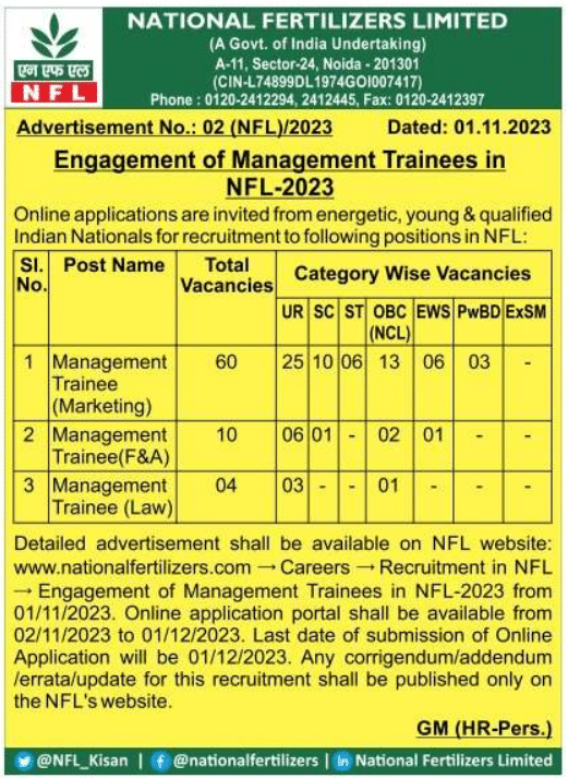 NFL Recruitment 2023: National Fertilizers Limited (NFL) has released a notification at nationalfertilizers.com for recruitment to the Post of Management Trainee in All India. Interested candidates can Apply Online on or before 01-Dec-2023.