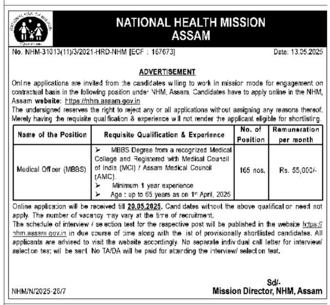 Eligible candidates can apply Online at NHM Assam official website nhm.assam.gov.in, Starts from 13-05-2025 to 20-May-2025