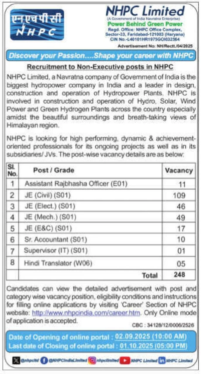 NHPC Recruitment 2025: National Hydro Electric Power Corporation (NHPC) has released a notification at nhpcindia.com for recruitment to the Post of Junior Engineer, Assistant Rajbhasha Officer in All India. Interested candidates can Apply Online on or before 01-Oct-2025.
