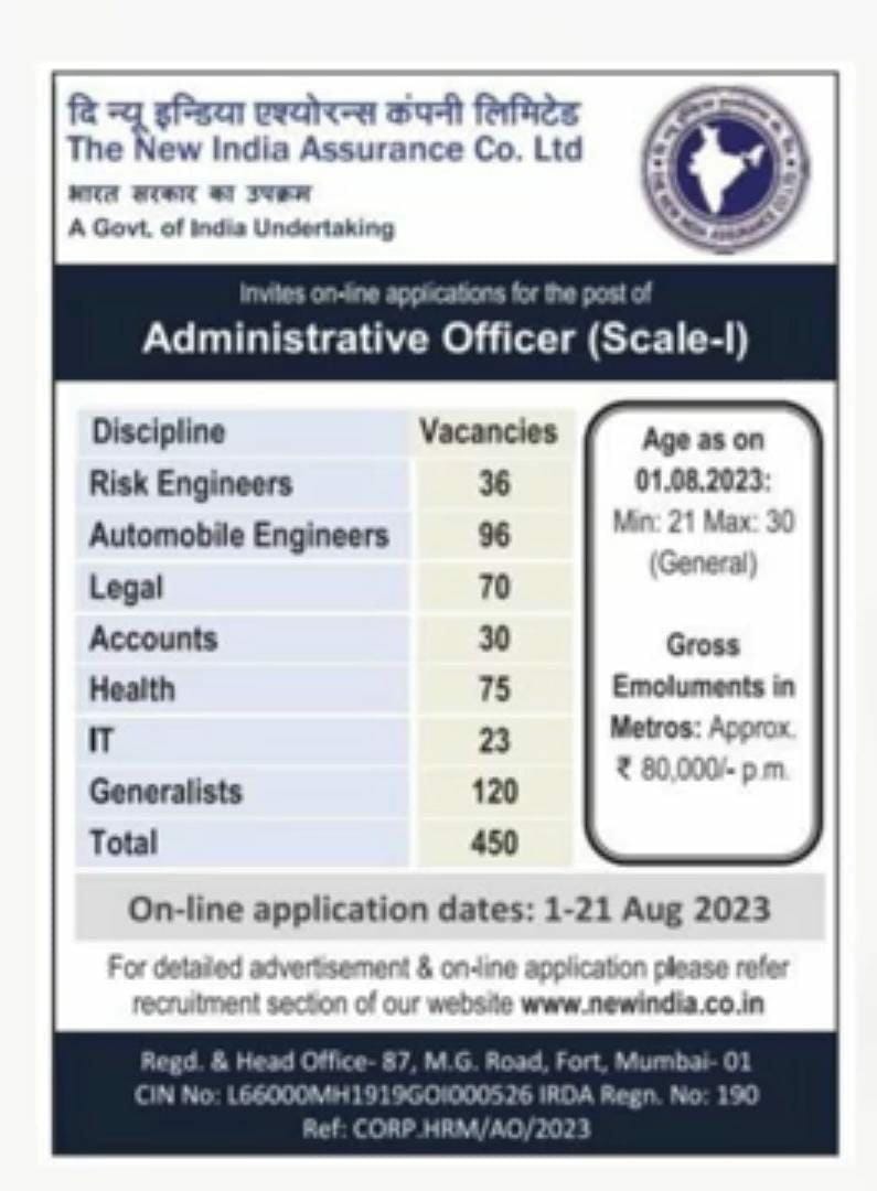 NIACL Recruitment 2023: The New India Assurance Company Limited (NIACL) has released a notification at newindia.co.in for recruitment to the Post of Administrative Officers (Generalists & Specialists) in All India. Interested candidates can Apply Online on or before 21-Aug-2023.