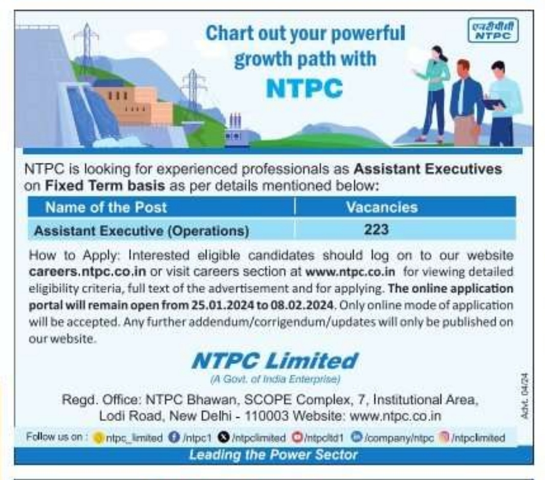 NTPC Recruitment 2024: National Thermal Power Corporation Limited (NTPC) has released a notification at ntpc.co.in for recruitment to the Post of Assistant Executive (Operations) in All India. Interested candidates can Apply Online on or before 08-Feb-2024.