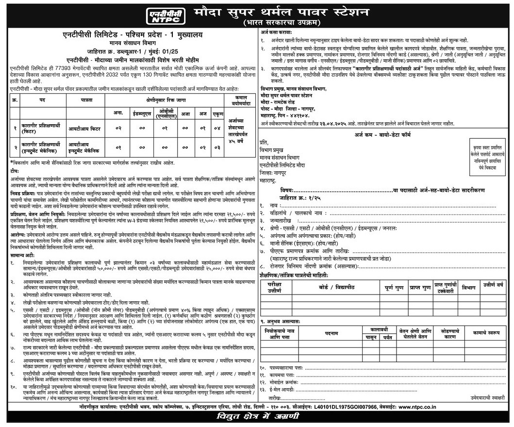 - At last sent the application form to below mentioned address:- Head of Department, Human Resources Department, Mouda Super Thermal Power Station, Mouda Ramtek Road, Post Mouda, District Nagpur, Maharashtra, Pin-441104 (in the prescribed manner, through- Register post, Speed post, or any other service) on or before 23-Apr-2025.