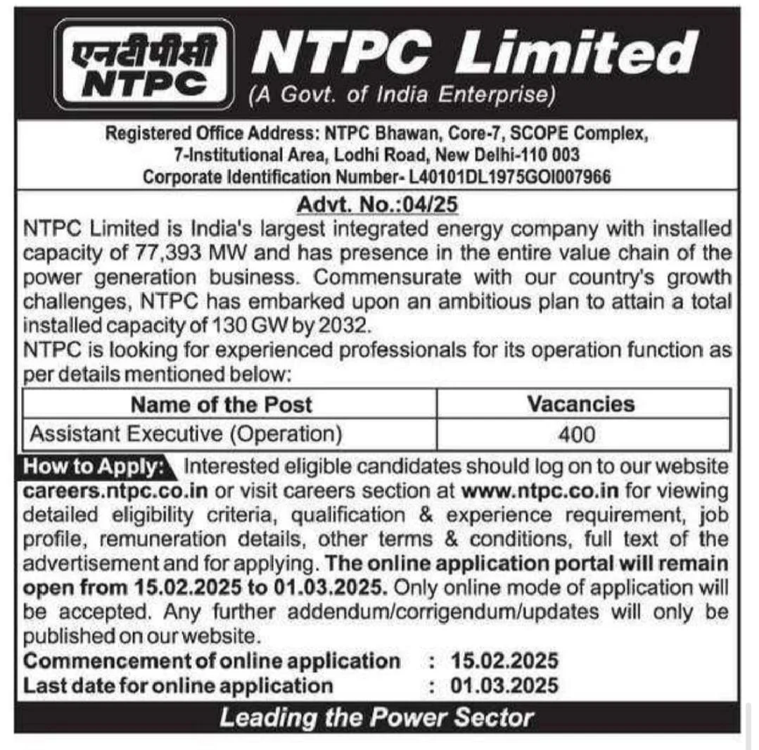 NTPC Recruitment 2025: National Thermal Power Corporation Limited (NTPC) has released a notification at ntpc.co.in for recruitment to the Post of Assistant Executive (Operation) in All India. Interested candidates can Apply Online on or before 01-Mar-2025.