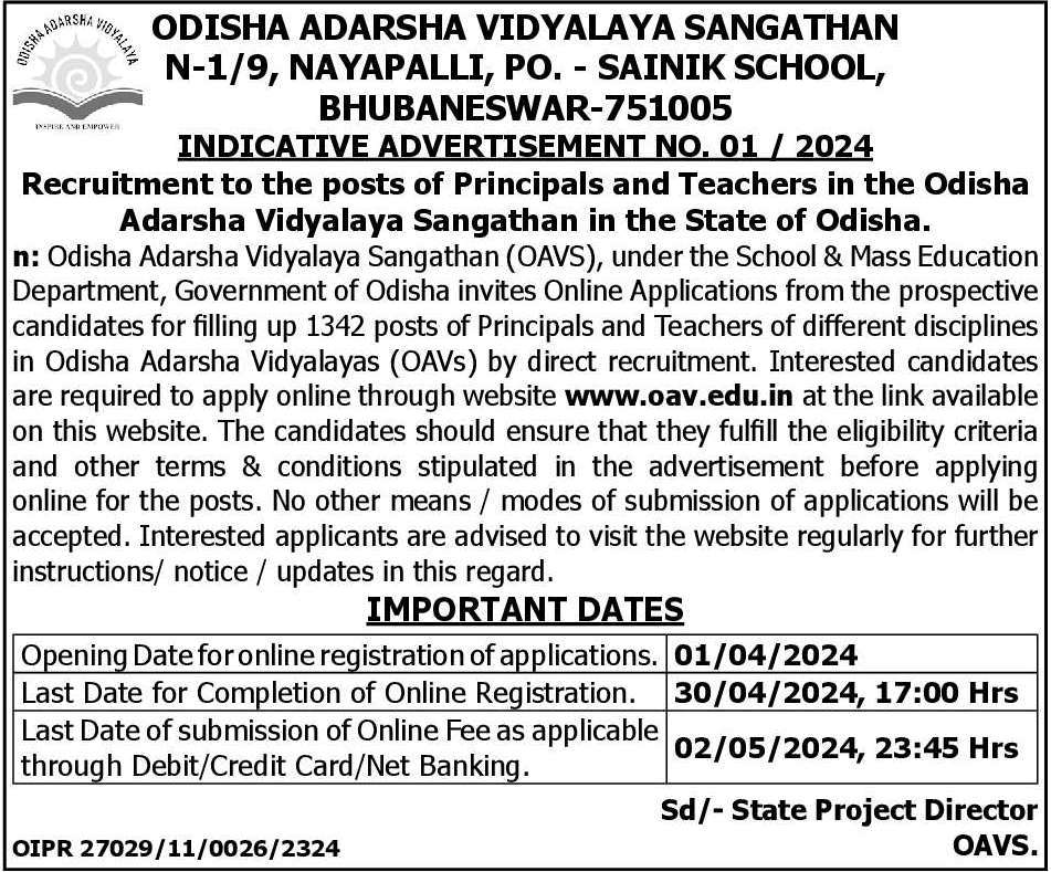 OAVS Recruitment 2024: Odisha Adarsha Vidyalaya Sangathan (OAVS) has released a notification at oav.edu.in for recruitment to the Post of Principal, Teacher in Odisha. Interested candidates can Apply Online on or before 30-Apr-2024.