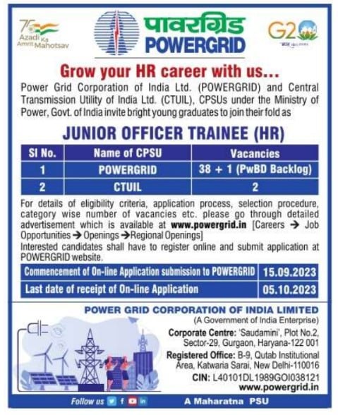 PGCIL Recruitment 2023: Power Grid Corporation of India Limited (PGCIL) has released a notification at powergridindia.com for recruitment to the Post of Junior Officer Trainee (HR) in All India. Interested candidates can Apply Online on or before 05-Oct-2023.