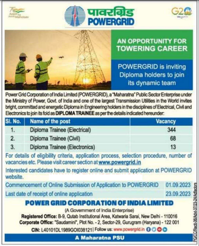 PGCIL Recruitment 2023: Power Grid Corporation of India Limited (PGCIL) has released a notification at powergridindia.com for recruitment to the Post of Diploma Trainee in All India. Interested candidates can Apply Online on or before 23-Sep-2023.