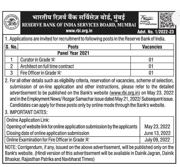 RBI Recruitment 2022: Reserve Bank of India (RBI) has released a notification at rbi.org.in for recruitment to the Post of Curator, Architect, Fire Officer in All India. Interested candidates can Apply Online on or before 13-Jun-2022.
