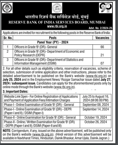 RBI Recruitment 2024: Reserve Bank of India (RBI) has released a notification at rbi.org.in for recruitment to the Post of Officers in All India. Interested candidates can Apply Online on or before 16-Aug-2024.
