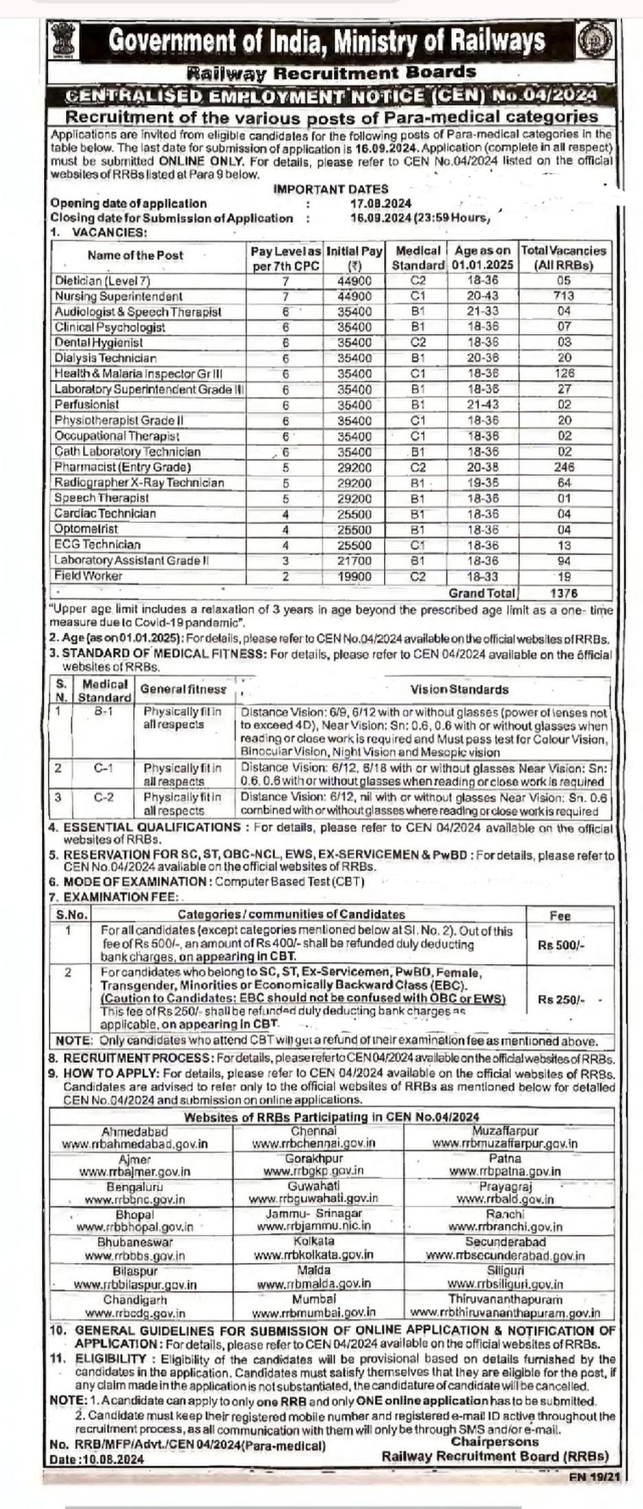 RRB Recruitment 2024: Railway Recruitment Board (RRB) has released a notification at indianrailways.gov.in for recruitment to the Post of Nursing Superintendent, Pharmacist in All India. Interested candidates can Apply Online on or before 16-Sep-2024.