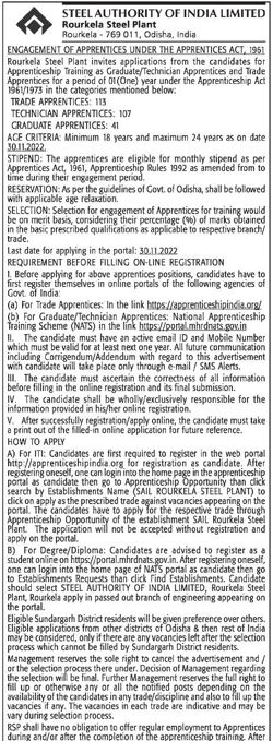SAIL Recruitment 2022: Steel Authority of India Limited (SAIL) has released a notification at sail.co.in for recruitment to the Post of Apprentice in Rourkela – Odisha. Interested candidates can Apply Online on or before 30-Nov-2022.