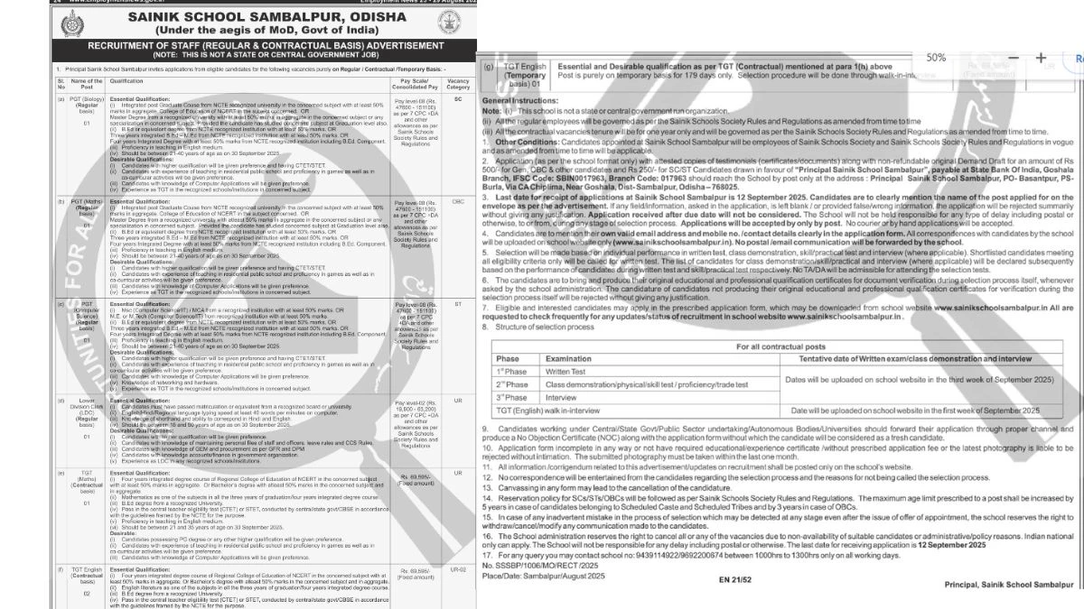 Sainik School Sambalpur Recruitment 2025: Sainik School Sambalpur (Sainik School Sambalpur) has released a notification at sainikschoolsambalpur.edu.in for recruitment to the Post of PGT, TGT in Sambalpur – Odisha. Interested candidates can Apply Offline on or before 12-Sep-2025.