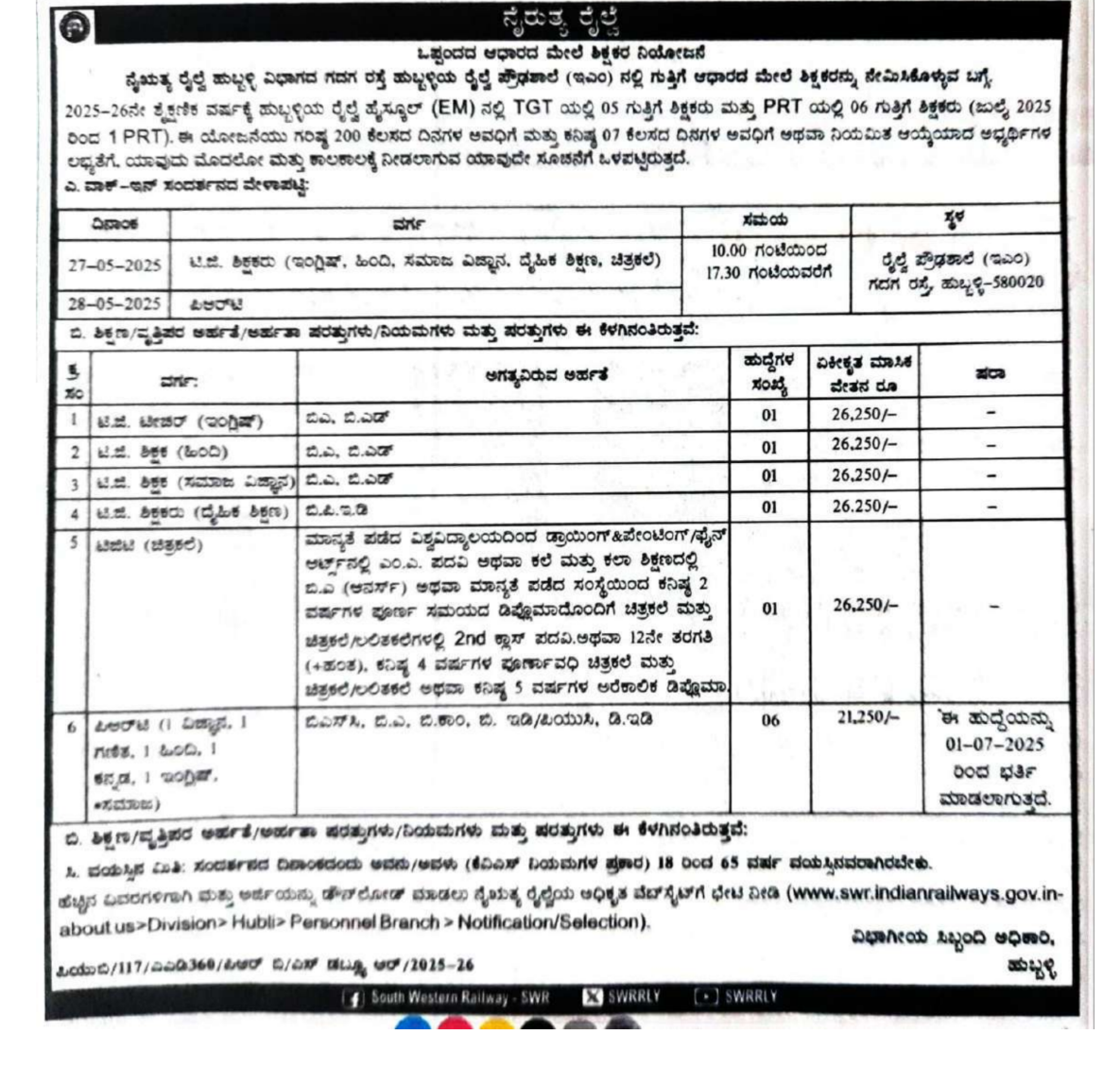 Interested and eligible candidates who searching for jobs in Karnataka can attend the walk-in-interview along with required documents (as mentioned in official notification) at the following venue: Railway High School/English Medium, Gadag Road, Hubballi-580020 on 28-May-2025.