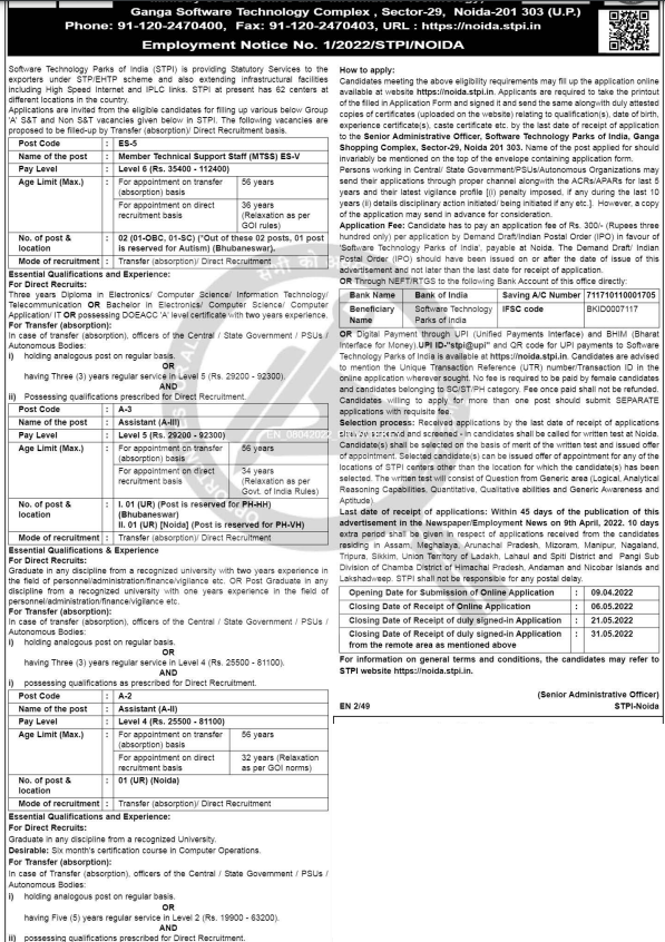 Interested and eligible candidates can apply online at stpi.in official website starts from 09-04-2022 to 06-May-2022. Applicant need to send the hard copy of the online application form along with relevant self-attested documents to the Senior Administrative Officer, Soft Ware Technology Parks of India, Ganga Shopping Complex, Sector – 29, Noida – 201303, Uttar Pradesh on or before 21st May 2022.
