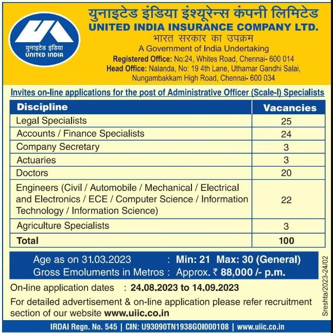 UIIC Recruitment 2023: United India Insurance Company Limited (UIIC) has released a notification at uiic.co.in for recruitment to the Post of Administrative Officer (Scale I) Specialist in All India. Interested candidates can Apply Online on or before 14-Sep-2023.
