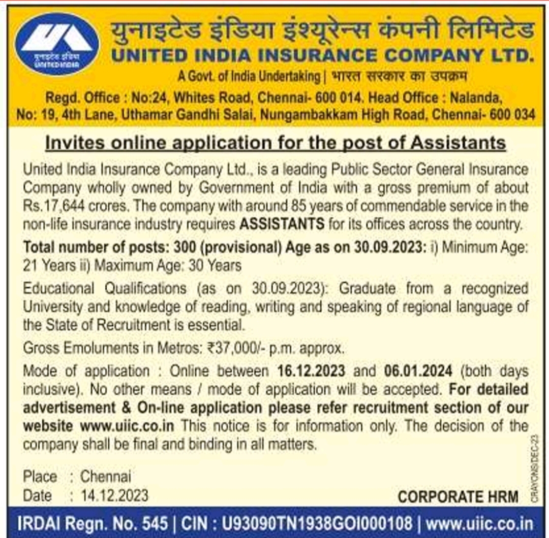 UIIC Recruitment 2024: United India Insurance Company Limited (UIIC) has released a notification at uiic.co.in for recruitment to the Post of Assistants in All India. Interested candidates can Apply Online on or before 06-Jan-2024.