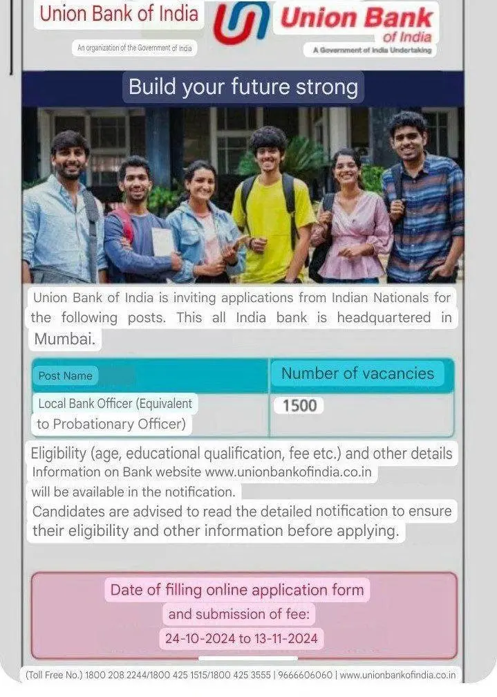 Eligible candidates can apply Online at Union Bank official website unionbankofindia.co.in, Starts from 24-10-2024 to 13-Nov-2024