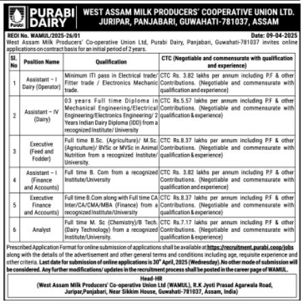 WAMUL Recruitment 2025: West Assam Milk Producers Cooperative Union Limited (WAMUL) has released a notification at purabi.org for recruitment to the Post of Executive, Assistant in Guwahati – Assam. Interested candidates can Apply Online on or before 30-Apr-2025