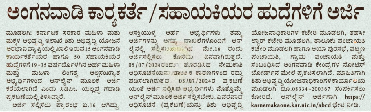 Age Limit: As per the Women & Child Development Department Belagavi Recruitment Notification, Candidate should have a minimum age of 19 years and Maximum of 35 years