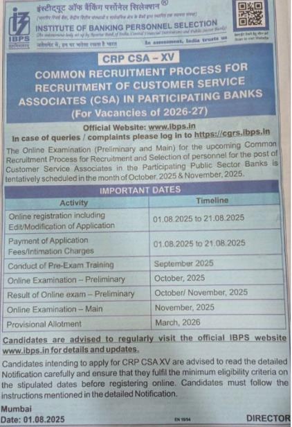IBPS Recruitment 2025: Institute of Banking Personnel Selection (IBPS) has released a notification at ibps.in for recruitment to the Post of Customer Service Associates in All India. Interested candidates can Apply Online on or before 21-Aug-2025 (Extended Upto 28th August 2025).