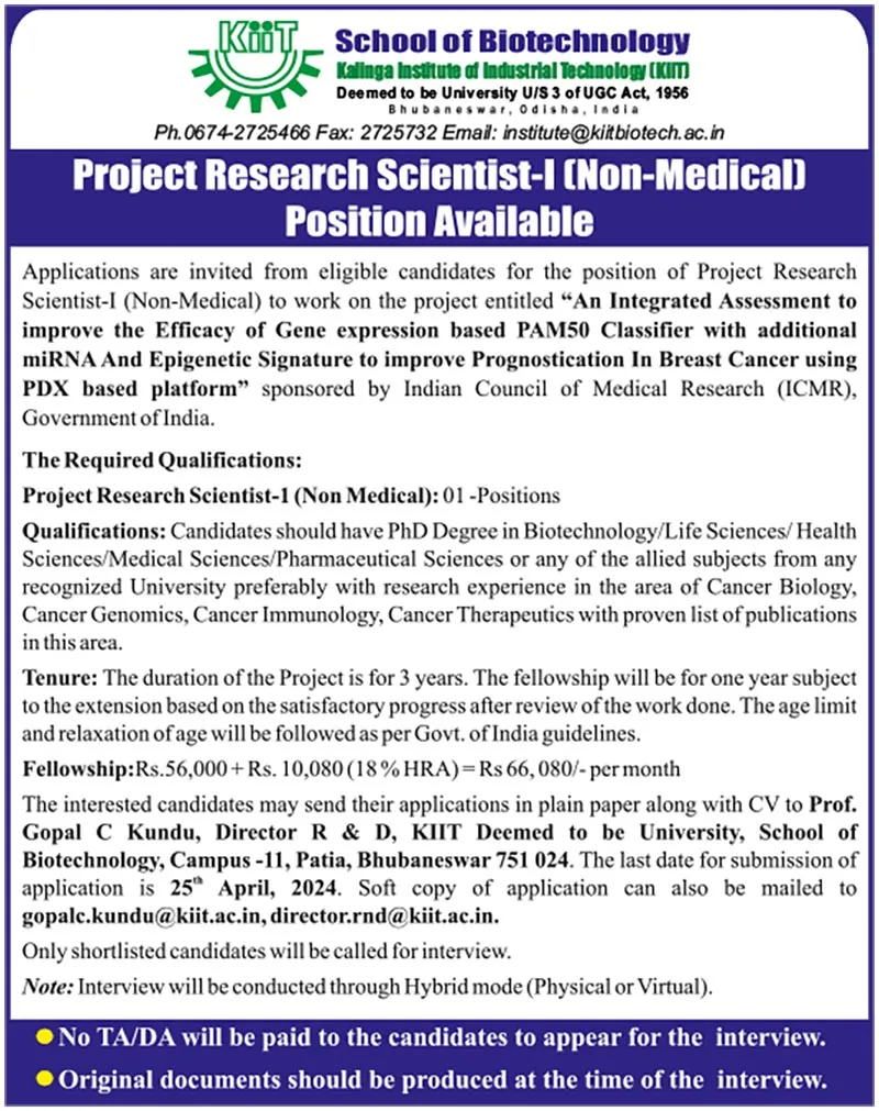 Interested and eligible candidates can apply offline through the prescribed application format. The Applicant needs to send the application form along with relevant self-attested documents to the Prof. Gopal C Kundu, Director R & D, KIIT Deemed to be University, School of Biotechnology, Campus-11, Patia, Bhubaneswar-751024 on or before 25-Apr-2024. Soft Copy of Application can also be send through Email Id: gopalc.kundu@kiit.ac.in, director.rnd@kiit.ac.in