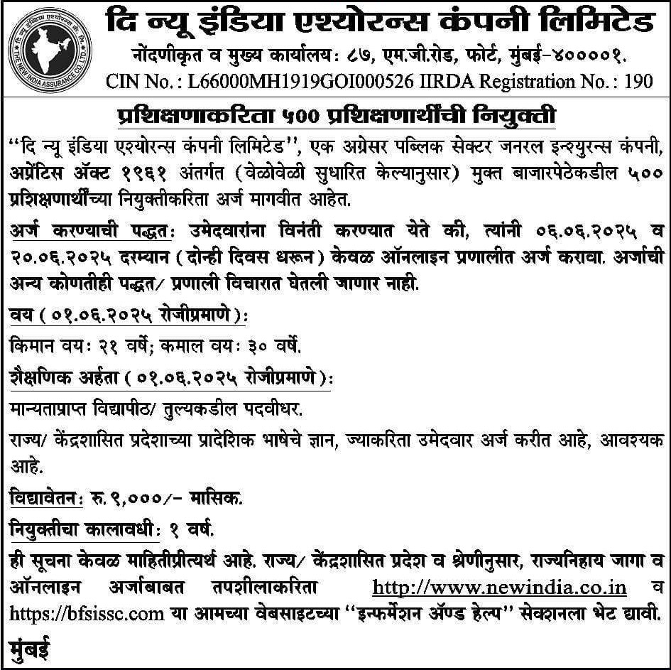 Age Limit: As per the The New India Assurance Company Limited Recruitment Notification, Candidate should have a minimum age of 21 years and Maximum of 30 years, as on 01-Jun-2025.