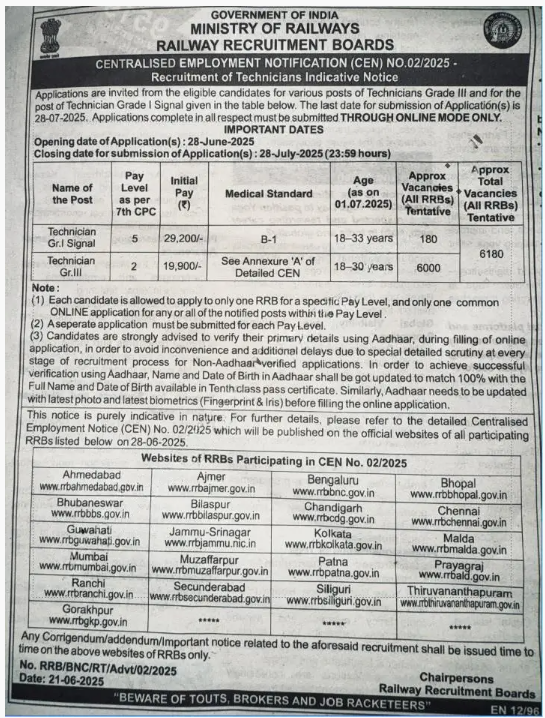 RRB Recruitment 2025: Railway Recruitment Board (RRB) has released a notification at indianrailways.gov.in for recruitment to the Post of Technician in All India. Interested candidates can Apply Online on or before 28-Jul-2025.