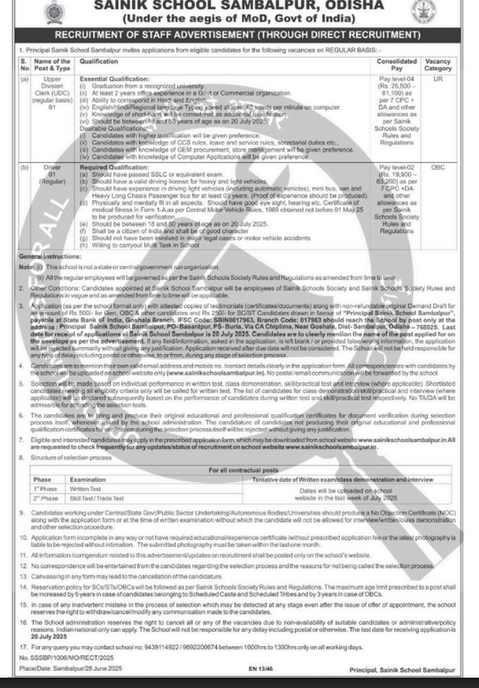 Sainik School Sambalpur Recruitment 2025: Sainik School Sambalpur (Sainik School Sambalpur) has released a notification at sainikschoolsambalpur.in for recruitment to the Post of UDC, Driver in Sambalpur – Odisha. Interested candidates can Apply Offline on or before 20-Jul-2025.